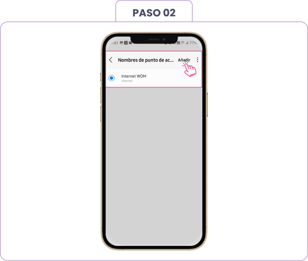 En Nombres de punto de acceso encontrarás Internet WOM de forma automática. Si quieres continuar la configuración, debes pinchar en Añadir para editar.