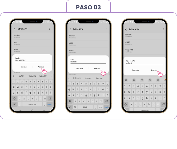Accederás a un menú donde podrás editar los accesos. Pincha en NOMBRE y escribe internet WOM, luego pincha en APN y escribes internet, por último, pincha en TIPO DE APN y escribe default.