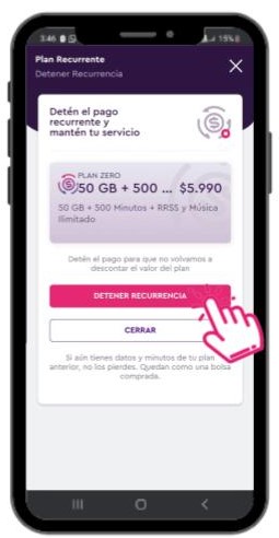 A continuación, se abrirá el detalle del plan, especificando lo que incluye y su consumo asociado. Además podrás renovar, cambiar el plan o detener el Plan Zero. Para darle de baja o detenerlo, debes pinchar en “Detener“.