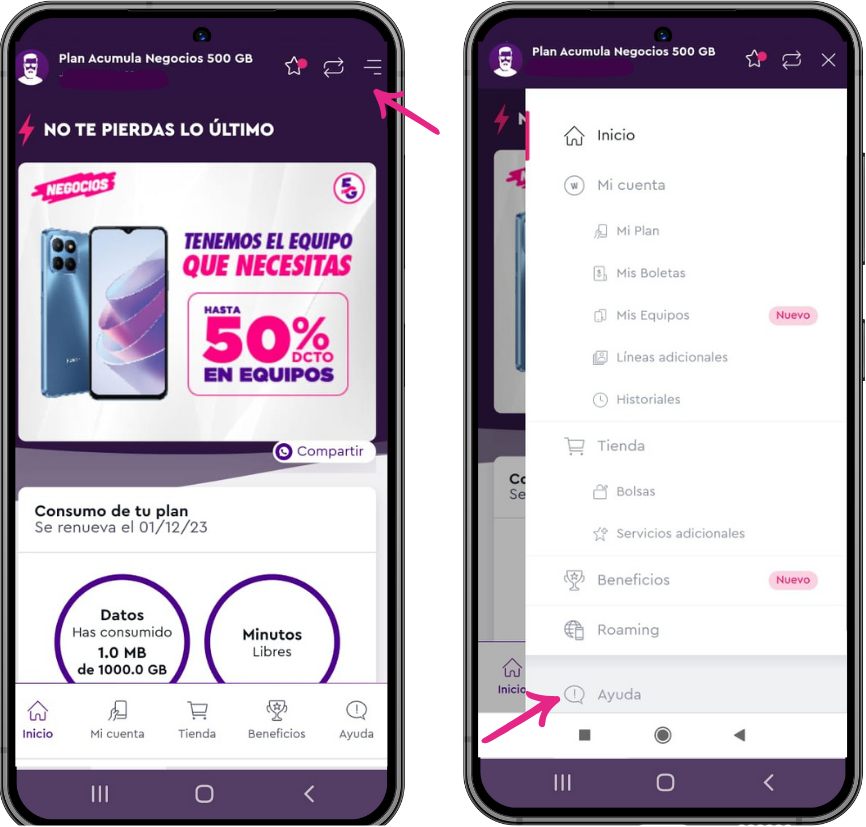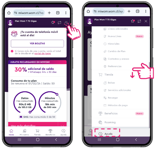 1. Inicia sesión en la plataforma virtual MIWOM desde tu celular o computador, seguidamente pincha el botón de 3 líneas ( ≡ ) ubicado arriba a la derecha y busca la opción de “Ayuda” deslizando el menú hacia abajo.