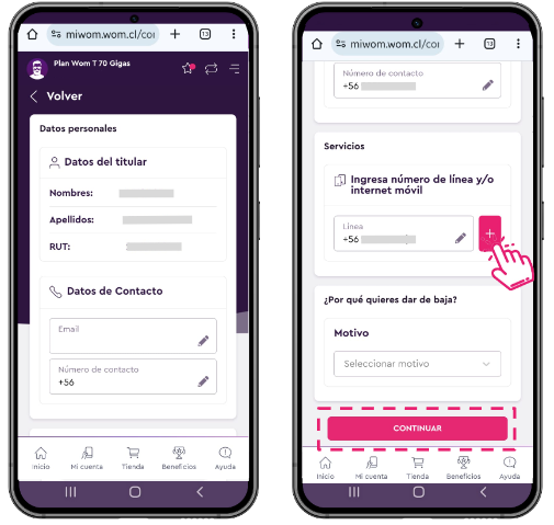 Deberás rellenar los campos que se necesitan para continuar, tu número de teléfono y/o de internet móvil o BAM (Banda Ancha Móvil) y el motivo por el cual quieres renunciar a tu plan, luego pincha “Continuar”.