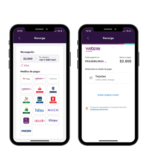 2. A continuación selecciona el medio de pago para luego hacer el pago en directamente desde la APP de WOM.