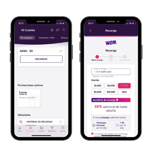 Para realizar una recarga ingresa a la App  WOM, o desde Mi Cuenta, Menú App, Inicio.