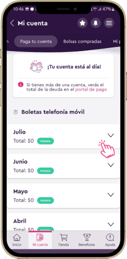 • Ingresa a la App a la sección sección “Ver Boletas” donde tendrás tus boletas mensuales. Pincha en el mes que necesitas revisar la fecha de vencimiento.
