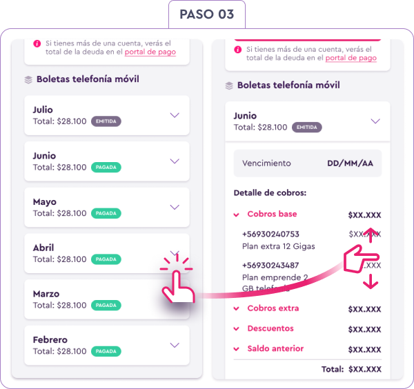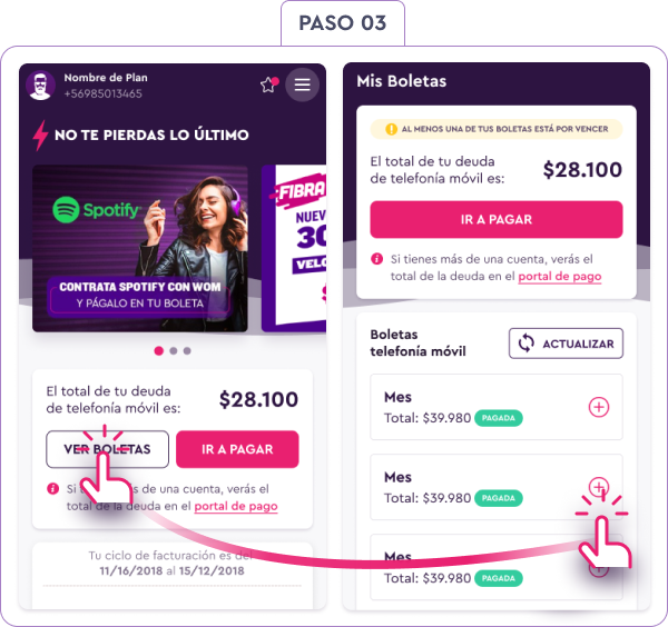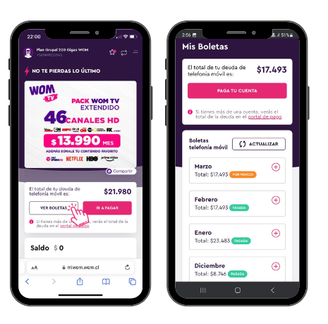 La boleta y el consumo de los meses anteriores, lo puedes revisar en nuestros canales digitales: MiWOM y desde la APP WOM.