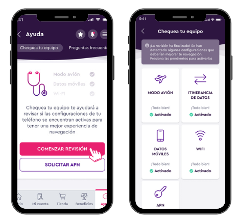 Chequea tu equipo es un proceso asistido que permite solucionar problemas de navegación a través de una revisión de las configuraciones del teléfono.