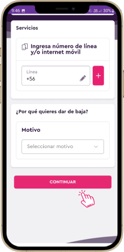 3. Visualizarás tus datos principales y deberás rellenar los campos que se necesitan para continuar, como tu número de teléfono y/o de internet móvil o BAM (Banda Ancha Móvil) pinchando el signo más (+) y el motivo por el cual quieres renunciar a tu plan, luego pincha “Continuar”.