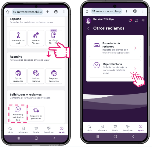 2. Ahora, desliza hacia abajo, hasta encontrar la sección “Solicitudes y reclamos”, pincha la opción “Reclamos y solicitud de baja”. A continuación podrás elegir la opción “Baja voluntaria” y te desplegará toda tu información.